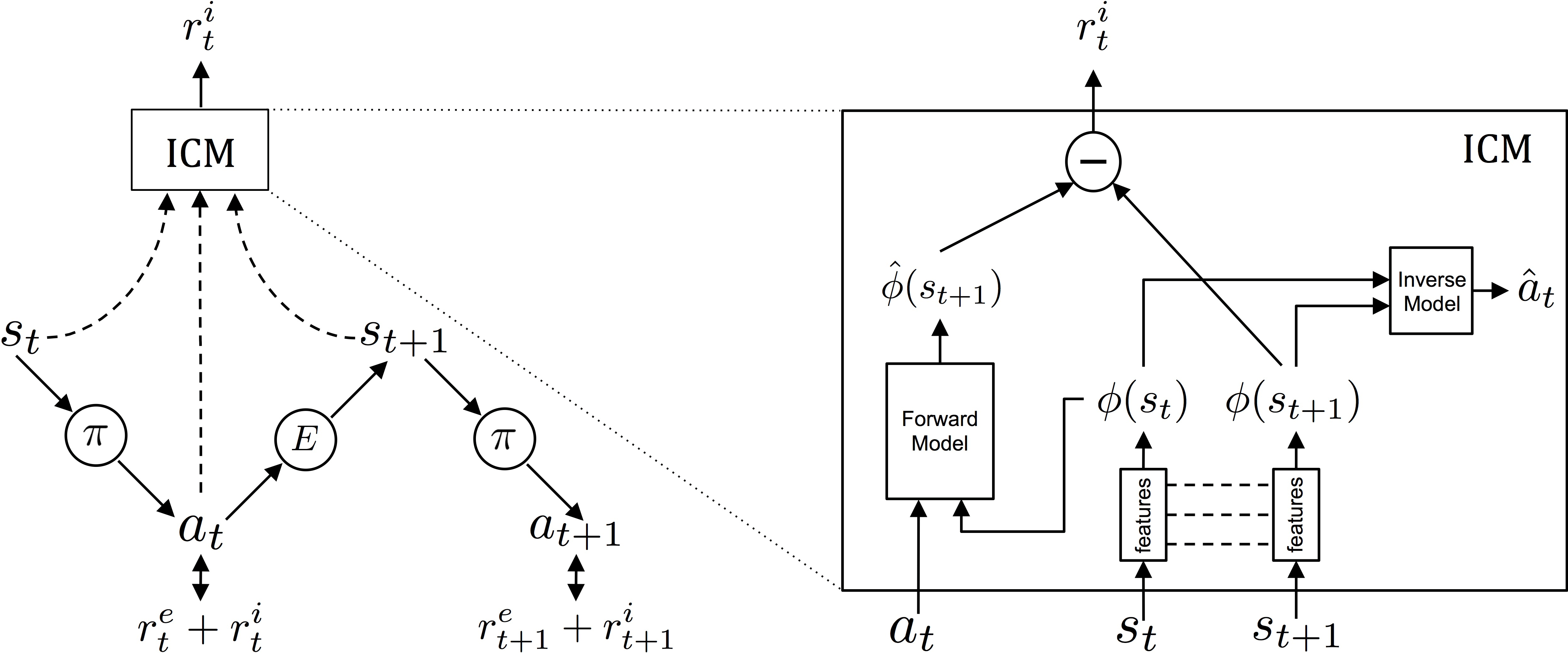 We use the ICM to output an intrinsic reward signal. It represents the curiosity, or how different the new state is. It takes in the previous state $s_t$, action $a_t$, and resulting state of the action $s_{t+1}$ and outputs $r^i_t$. How is it computed?